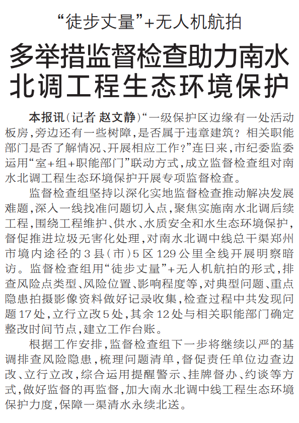 多举措监督检查助力南水北调工程生态环境保护