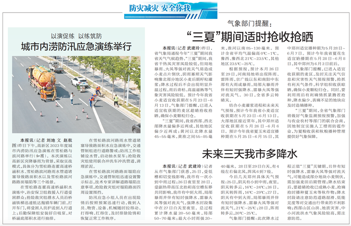昨日下午,高新区2023年度城市内涝防汛应急演练在雪松路与滨河路举行。本次演练以高新区突降暴雨为背景,采取实战模式,具体分为雪松路连霍高速桥涵积水、雪松路滨河路雨水管道堵塞导致路面积水以及雪松路滨河路路面塌陷等三个场景。(今日《郑州日报》2版)