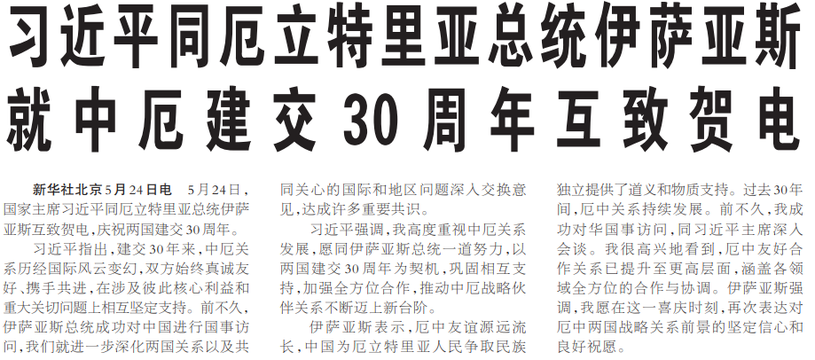 5月24日,国家主席习近平同厄立特里亚总统伊萨亚斯互致贺电,庆祝两国建交30周年。(今日《人民日报》1版)
