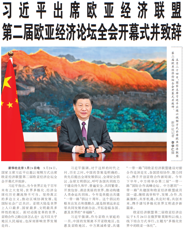 5月24日,国家主席习近平应邀以视频方式出席欧亚经济联盟第二届欧亚经济论坛全会开幕式并致辞。