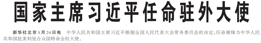 中华人民共和国主席习近平根据全国人民代表大会常务委员会的决定,任命谢锋为中华人民共和国驻美利坚合众国特命全权大使。(今日《人民日报》1版)