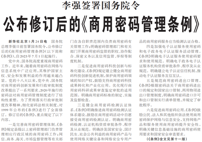 国务院总理李强日前签署国务院令,公布修订后的《商用密码管理条例》,自2023年7月1日起施行。(今日《人民日报》2版)