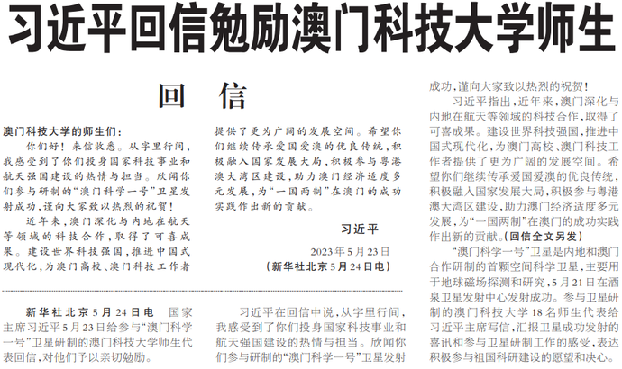 国家主席习近平5月23日给参与“澳门科学一号”卫星研制的澳门科技大学师生代表回信,对他们予以亲切勉励。(今日《人民日报》1版)