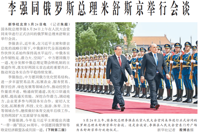 国务院总理李强5月24日上午在人民大会堂同来华进行正式访问的俄罗斯总理米舒斯京举行会谈。(今日《人民日报》1版、2版)