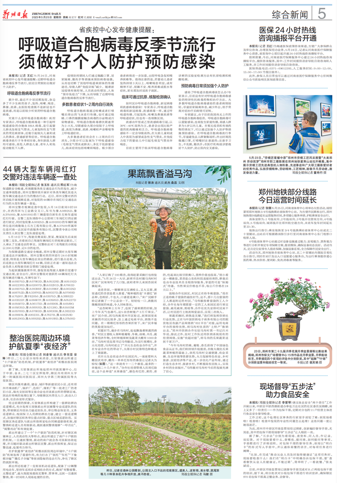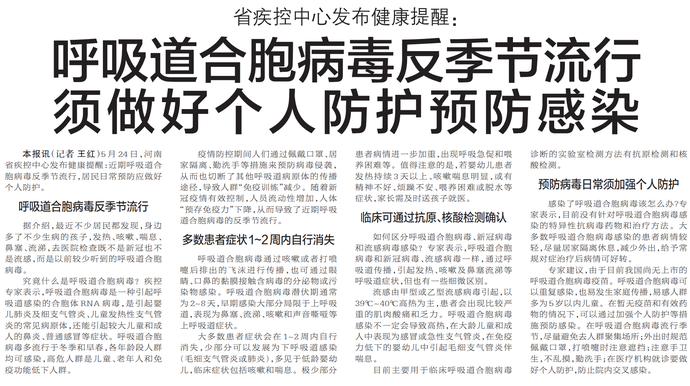 5月24日,河南省疾控中心发布健康提醒:近期呼吸道合胞病毒反季节流行,居民日常预防应做好个人防护。(今日《郑州日报》5版)