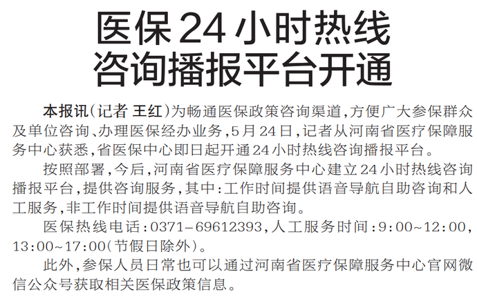 为畅通医保政策咨询渠道,方便广大参保群众及单位咨询、办理医保经办业务,5月24日,记者从河南省医疗保障服务中心获悉,省医保中心即日起开通24小时热线咨询播报平台。(今日《郑州日报》5版)
