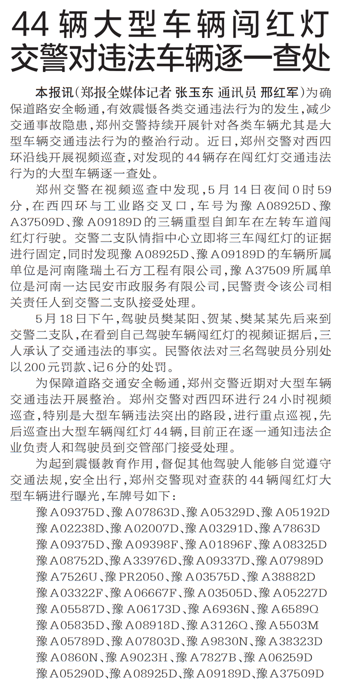 为确保道路安全畅通,有效震慑各类交通违法行为的发生,减少交通事故隐患,郑州交警持续开展针对各类车辆尤其是大型车辆交通违法行为的整治行动。近日,郑州交警对西四环沿线开展视频巡查,对发现的44辆存在闯红灯交通违法行为的大型车辆逐一查处。(今日《郑州日报》5版)