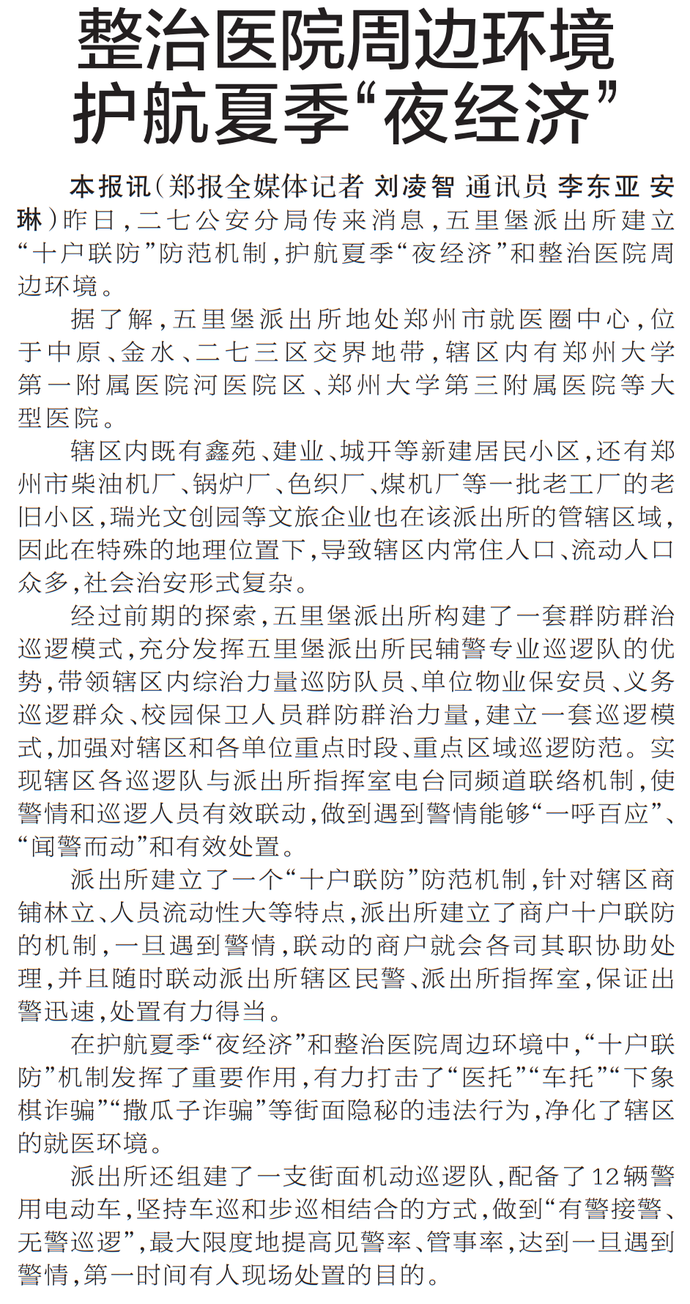 昨日,二七公安分局传来消息,五里堡派出所建立“十户联防”防范机制,护航夏季“夜经济”和整治医院周边环境。(今日《郑州日报》5版)