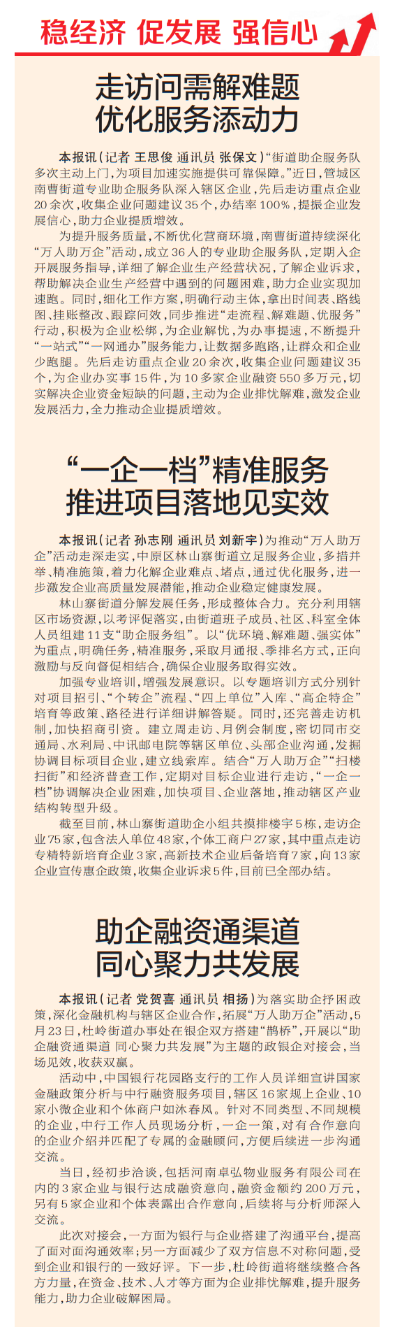 “街道助企服务队多次主动上门,为项目加速实施提供可靠保障。”近日,管城区南曹街道专业助企服务队深入辖区企业,先后走访重点企业20余次,收集企业问题建议35个,办结率100%,提振企业发展信心,助力企业提质增效。(今日《郑州日报》7版)