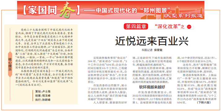 本报特推出【家国同春】——中国式现代化的“郑州图景”大型系列报道,全方位展示郑州市全力以赴跑出高质量发展“加速度”的干劲和蓬勃的朝气。今日刊发第四篇章“深化改革”之一《近悦远来百业兴》。