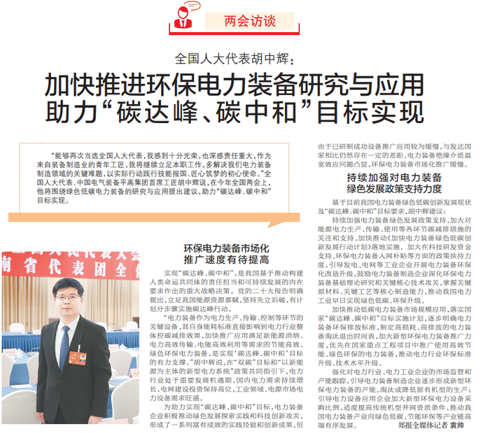 “能够再次当选全国人大代表,我感到十分光荣,也深感责任重大,作为来自装备制造业的青年工匠,我将继续立足本职工作,多解决我们电力装备制造领域的关键难题,以实际行动践行技能报国、匠心筑梦的初心使命。”全国人大代表、中国电气装备平高集团首席工匠胡中辉说,在今年全国两会上,他将围绕绿色低碳电力装备的研究与应用提出建议,助力“碳达峰、碳中和”目标实现。(今日《郑州日报》4版)