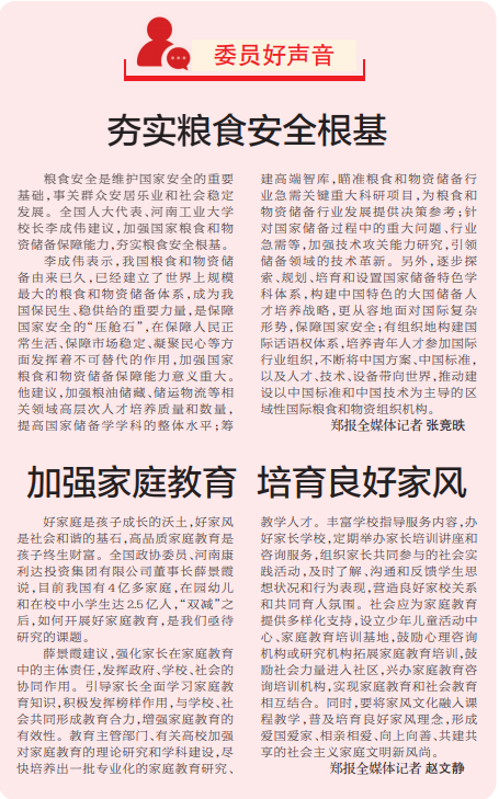 好家庭是孩子成长的沃土,好家风是社会和谐的基石,高品质家庭教育是孩子终生财富。全国政协委员、河南康利达投资集团有限公司董事长薛景霞说,目前我国有4亿多家庭,在园幼儿和在校中小学生达2.5亿人,“双减”之后,如何开展好家庭教育,是我们亟待研究的课题。(今日《郑州日报》4版)