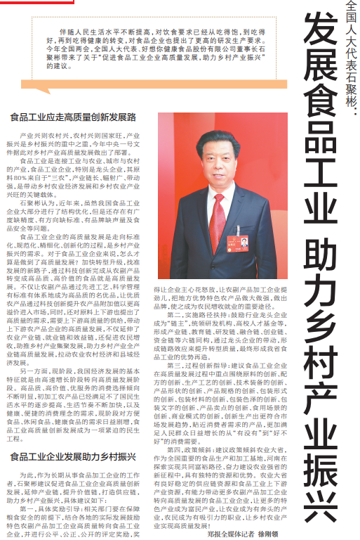 伴随人民生活水平不断提高,对饮食要求已经从吃得饱,到吃得好,再到吃得健康的转变,对食品企业也提出了更高的研发生产要求。今年全国两会,全国人大代表、好想你健康食品股份有限公司董事长石聚彬带来了关于“促进食品工业企业高质量发展,助力乡村产业振兴”的建议。(今日《郑州日报》5版)