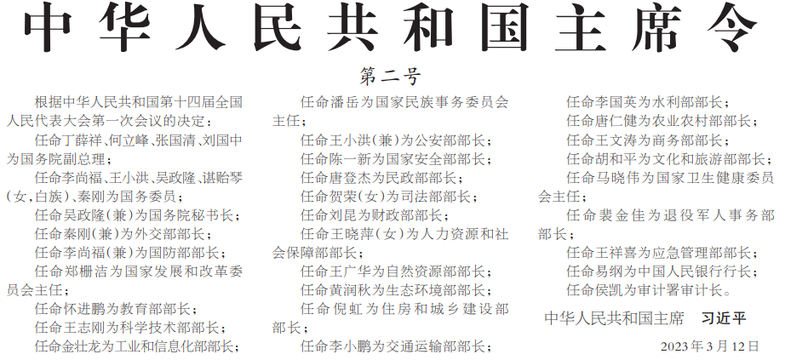 十四届全国人大一次会议12日上午在北京人民大会堂举行第五次全体会议,决定了国务院其他组成人员。国家主席习近平签署第二号主席令,根据大会的决定,对这次大会表决通过的国务院其他组成人员予以任命。