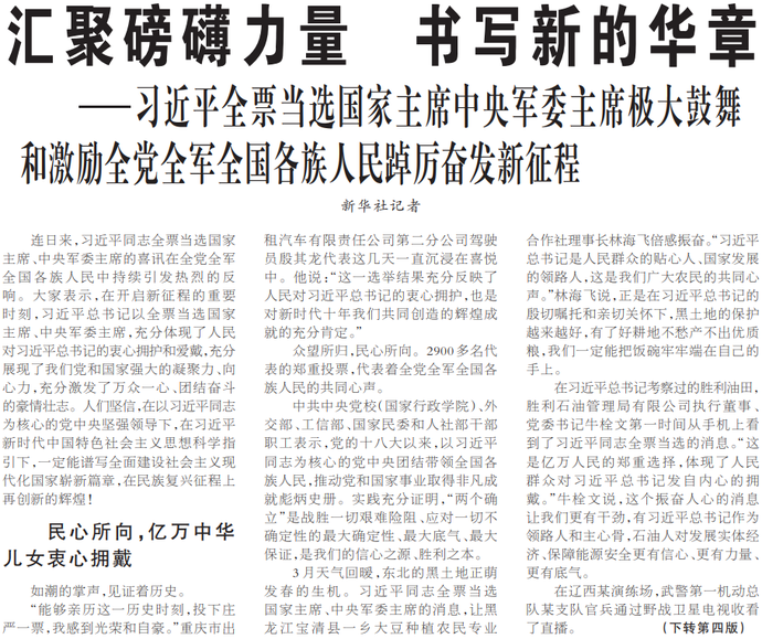 连日来,习近平同志全票当选国家主席、中央军委主席的喜讯在全党全军全国各族人民中持续引发热烈的反响。大家表示,在开启新征程的重要时刻,习近平总书记以全票当选国家主席、中央军委主席,充分体现了人民对习近平总书记的衷心拥护和爱戴,充分展现了我们党和国家强大的凝聚力、向心力,充分激发了万众一心、团结奋斗的豪情壮志。人们坚信,在以习近平同志为核心的党中央坚强领导下,在习近平新时代中国特色社会主义思想科学指引下,一定能谱写全面建设社会主义现代化国家崭新篇章,在民族复兴征程上再创新的辉煌!(今日《人民日报》1版、4版)