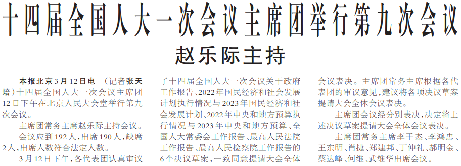 十四届全国人大一次会议主席团12日下午在北京人民大会堂举行第九次会议。(今日《人民日报》1版)