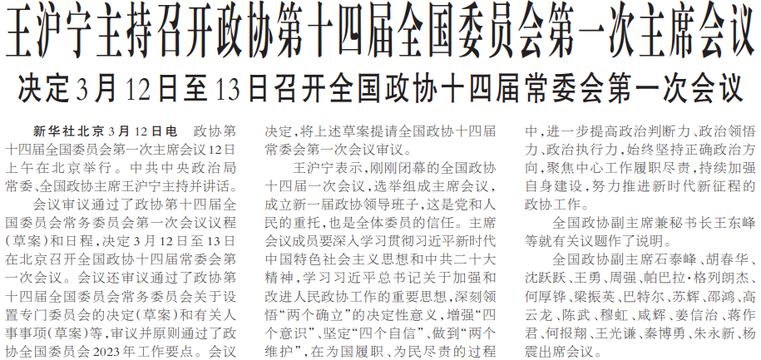 决定3月12日至13日召开全国政协十四届常委会第一次会议