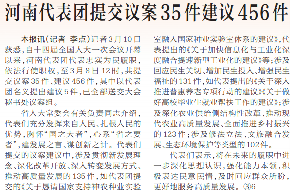 记者3月10日获悉,自十四届全国人大一次会议开幕以来,河南代表团代表忠实为民履职,依法行使职权,至3月8日12时,共提交议案35件、建议456件,其中以代表团名义提出建议5件,已全部送交大会秘书处议案组。(今日《河南日报》5版)