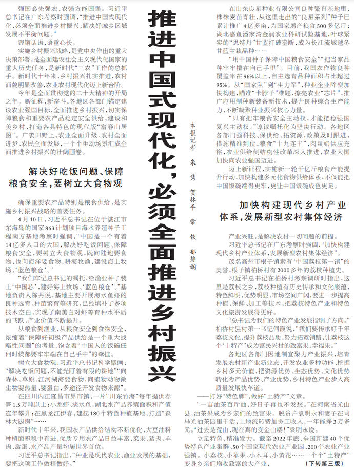 强国必先强农,农强方能国强。习近平总书记在广东考察时强调,“推进中国式现代化,必须全面推进乡村振兴,解决好城乡区域发展不平衡问题。”(今日《人民日报》1版、3版)