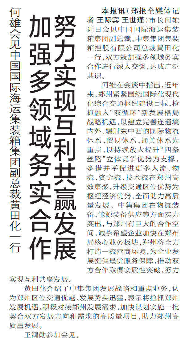 市长何雄近日会见中国国际海运集装箱集团副总裁、中集集团集装箱控股有限公司总裁黄田化一行,双方就加强多领域务实合作进行深入交谈,达成广泛共识。(今日《郑州日报》1版)
