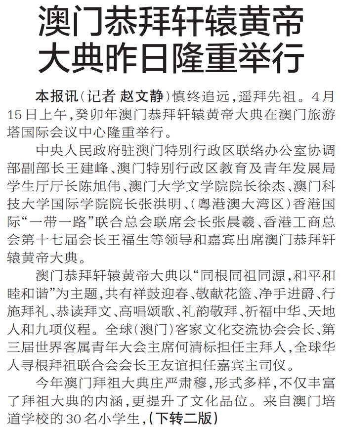 慎终追远,遥拜先祖。4月15日上午,癸卯年澳门恭拜轩辕黄帝大典在澳门旅游塔国际会议中心隆重举行。(今日《郑州日报》1版、2版)