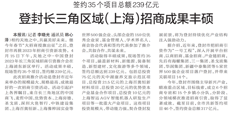 登封长三角区域(上海)招商成果丰硕