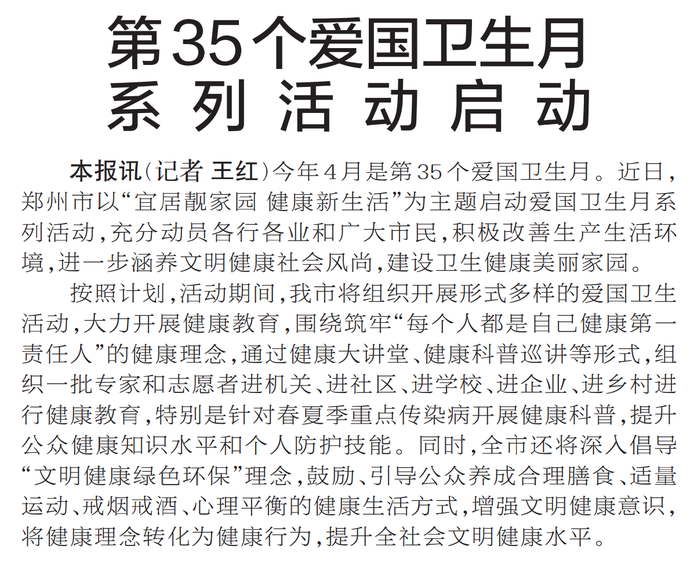 今年4月是第35个爱国卫生月。近日,郑州市以“宜居靓家园 健康新生活”为主题启动爱国卫生月系列活动,充分动员各行各业和广大市民,积极改善生产生活环境,进一步涵养文明健康社会风尚,建设卫生健康美丽家园。(今日《郑州日报》1版)