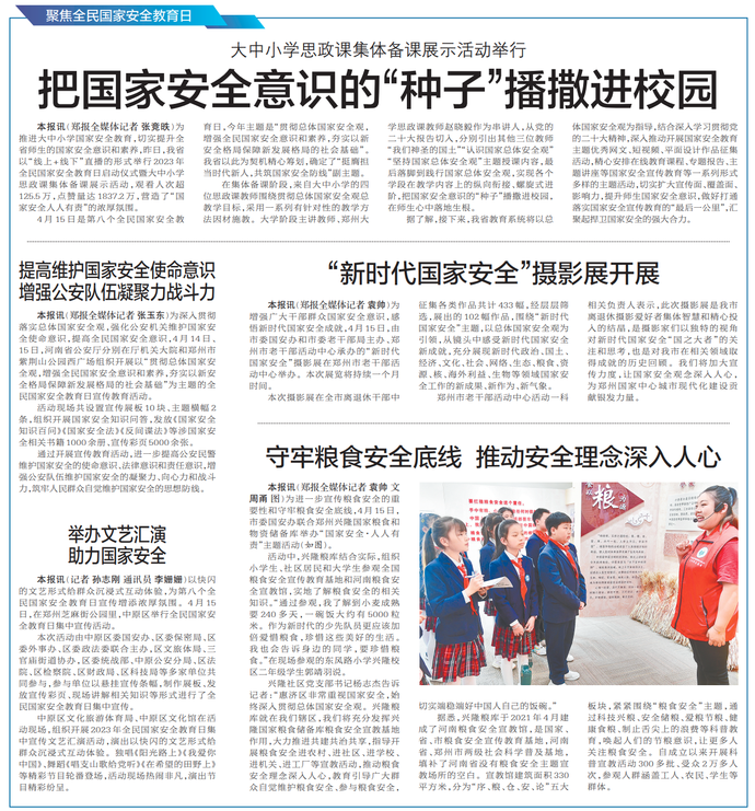 为进一步宣传粮食安全的重要性和守牢粮食安全底线,4月15日,市委国安办联合郑州兴隆国家粮食和物资储备库举办“国家安全·人人有责”主题活动。(今日《郑州日报》2版)