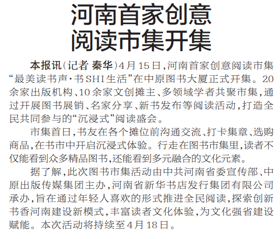 4月15日,河南首家创意阅读市集“最美读书声·书SHI生活”在中原图书大厦正式开集。20余家出版机构、10余家文创摊主、多领域学者共聚市集,通过开展图书展销、名家分享、新书发布等阅读活动,打造全民共同参与的“沉浸式”阅读盛会。(今日《郑州日报》2版)