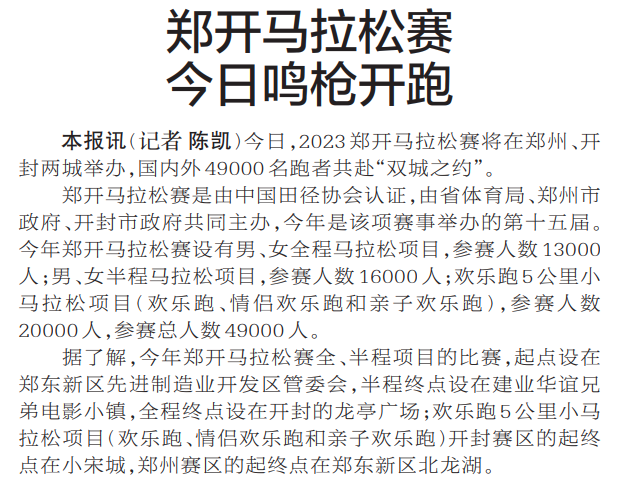 今日,2023郑开马拉松赛将在郑州、开封两城举办,国内外49000名跑者共赴“双城之约”。(今日《郑州日报》2版)