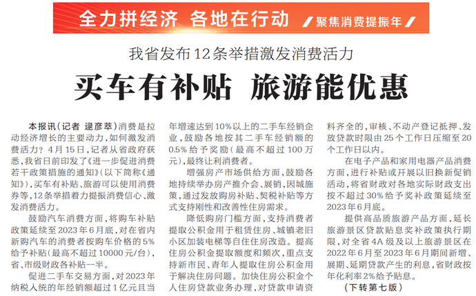 消费是拉动经济增长的主要动力,如何激发消费活力?4月15日,记者从省政府获悉,我省日前印发了《进一步促进消费若干政策措施的通知》(以下简称《通知》),买车有补贴、旅游可以使用消费券等,12条举措着力提振消费信心、激发消费活力。(今日《河南日报》1版、7版)