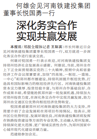 市长何雄近日会见河南铁建投集团董事长悦国勇一行,双方就进一步深化务实合作进行座谈交流。(今日《郑州日报》1版)