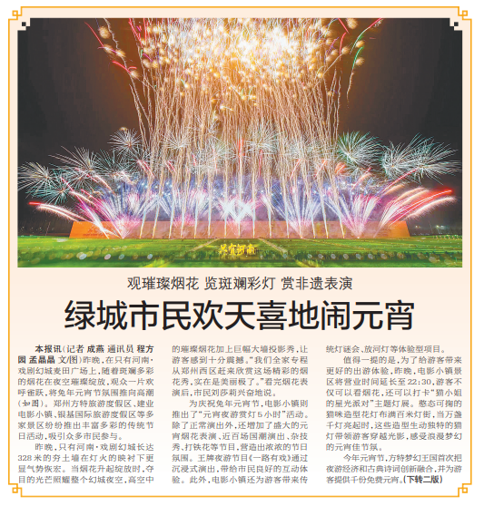 昨晚,在只有河南·戏剧幻城麦田广场上,随着斑斓多彩的烟花在夜空璀璨绽放,观众一片欢呼雀跃,将兔年元宵节氛围推向高潮。郑州方特旅游度假区、建业电影小镇、银基国际旅游度假区等多家景区纷纷推出丰富多彩的传统节日活动,吸引众多市民参与。(今日《郑州日报》1版、2版)