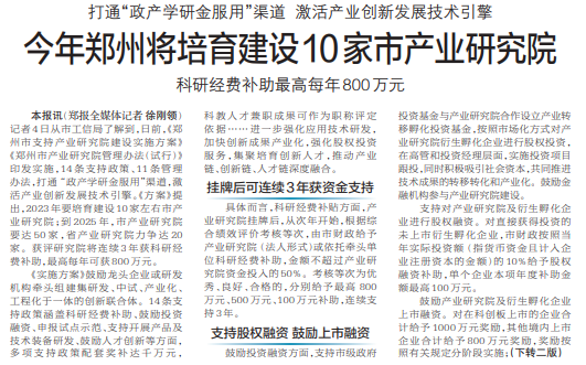 记者4日从市工信局了解到,日前,《郑州市支持产业研究院建设实施方案》《郑州市产业研究院管理办法(试行)》印发实施,14条支持政策、11条管理办法,打通 “政产学研金服用”渠道,激活产业创新发展技术引擎。《方案》提出,2023年要培育建设10家左右市产业研究院;到2025年,市产业研究院要达50家,省产业研究院力争达20家。获评研究院将连续3年获科研经费补助,最高每年可获800万元。(今日《郑州日报》1版、2版)