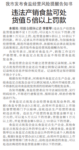 违法生产经营食盐货值金额不足1万元的,可以处5万元以下罚款;货值金额1万元以上的,处货值金额5倍以上10倍以下的罚款。昨日,记者从市市场监管局获悉,为加强食盐经营管理,规范市场经营秩序,依据相关法律法规及相关政策规定,我市发布食盐经营风险提醒告知书。(今日《郑州日报》2版)