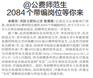 记者近日从省教育厅获悉,我省将为公费师范生提供2084个有编制岗位,并于2月5日~3月5日举办网络双选会,招聘单位和岗位一并发布。(今日《郑州日报》2版)