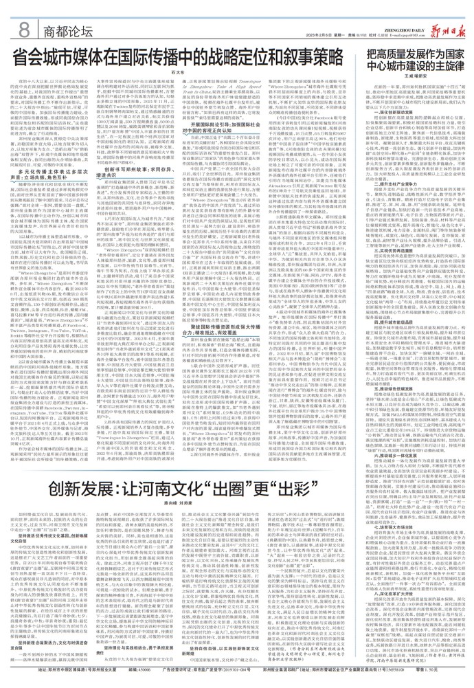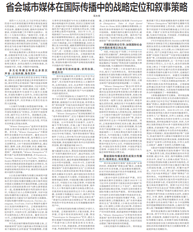 郑州报业集团深入贯彻党中央决策部署,站稳国家外宣大局,以地方故事为切入点,以地方形象为支点,“造船出海”与“借船出海”双管齐下,形成中央媒体和地市级媒体相互配合、协同出海的大合唱协奏曲,共同展现可信、可爱、可敬的中国形象。(今日《郑州日报》8版)