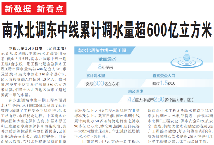 记者从水利部、中国南水北调集团获悉:截至2月5日,南水北调东中线一期工程(含东线一期工程北延应急供水工程)累计调水量突破600亿立方米,惠及沿线42座大中城市280多个县(市、区),直接受益人口超过1.5亿人。按照黄河多年平均天然径流量580亿立方米计算,相当于为北方地区调来了超过黄河一年的水量。(今日《人民日报》1版)