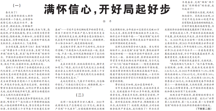 习近平总书记在2023年春节团拜会上发表重要讲话指出:“2023年是全面贯彻党的二十大精神的开局之年,希望与挑战并存。我们要坚持稳字当头、稳中求进,更好统筹国内国际两个大局,更好统筹疫情防控和经济社会发展,更好统筹发展和安全,全面深化改革开放,努力实现经济运行整体好转,推动人民生活持续改善。只要我们坚定信心、顽强拼搏,就一定能够实现新征程的良好开局。”
