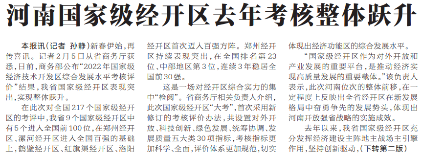 新春伊始,再传喜讯。记者2月5日从省商务厅获悉,日前,商务部公布“2022年国家级经济技术开发区综合发展水平考核评价”结果,我省国家级经开区表现突出,实现整体跃升。