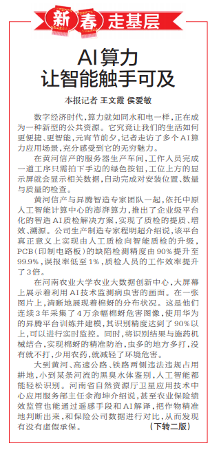 数字经济时代,算力就如同水和电一样,正在成为一种新型的公共资源。它究竟让我们的生活如何更便捷、更智能,元宵节前夕,记者走访了多个AI算力应用场景,充分感受到它的无穷魅力。(今日《郑州日报》1版、2版)