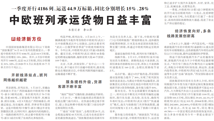一季度开行4186列、运送44.9万标箱,同比分别增长15%、28%