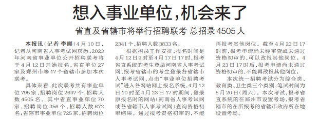 4月10日,记者从河南省人事考试网获悉,2023年河南省事业单位公开招聘联考将于4月12日开始报名,省直单位27家及郑州市等17个省辖市参加本次联考。(今日《郑州日报》2版)
