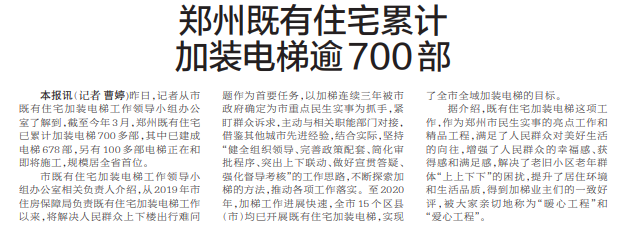 郑州既有住宅累计加装电梯逾700部