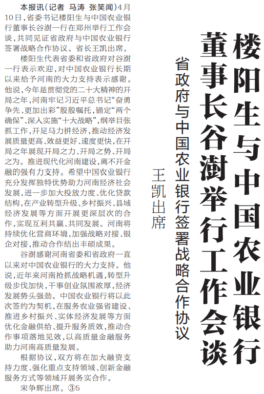 4月10日,省委书记楼阳生与中国农业银行董事长谷澍一行在郑州举行工作会谈,共同见证省政府与中国农业银行签署战略合作协议。省长王凯出席。(今日《河南日报》1版)