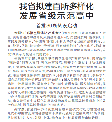 为全面提升普通高中育人质量,实现普通高中教育从分层教育逐步向分类教育发展,省教育厅日前印发通知提出,“十四五”时期,全省力争建设100所涵盖科技、人文、外语、艺体、综合高中等领域,具有成熟的特色育人体系、稳定鲜明的办学风格、较高办学品质的普通高中多样化发展省级示范校,首批30所示范校名单同时发布。(今日《郑州日报》6版)