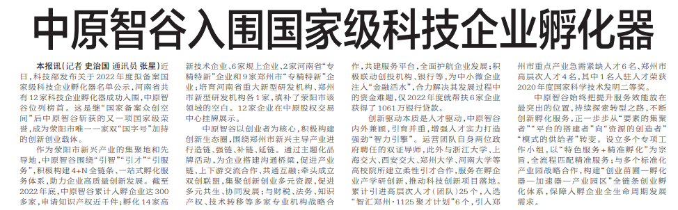 近日,科技部发布关于2022年度拟备案国家级科技企业孵化器名单公示,河南省共有12家科技企业孵化器成功入围,中原智谷位列榜首。这是继“国家备案众创空间”后中原智谷斩获的又一项国家级荣誉,成为荥阳市唯一一家双“国字号”加持的创新创业载体。(今日《郑州日报》7版)