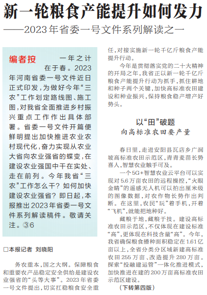 务农重本,国之大纲。保障粮食和重要农产品稳定安全供给是建设农业强省的“头等大事”。2023年省委一号文件提出,切实扛稳粮食安全重任,对接实施新一轮千亿斤粮食产能提升行动。(今日《河南日报》1版、4版)