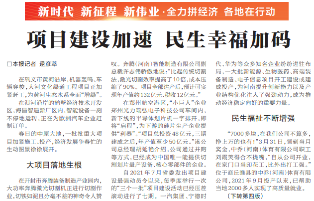 春日的中原大地,一批批重大项目加紧施工、投产,经济发展争春忙的生动图景徐徐展开。(今日《河南日报》1版、4版)