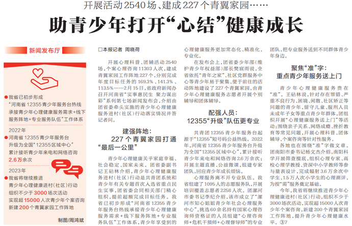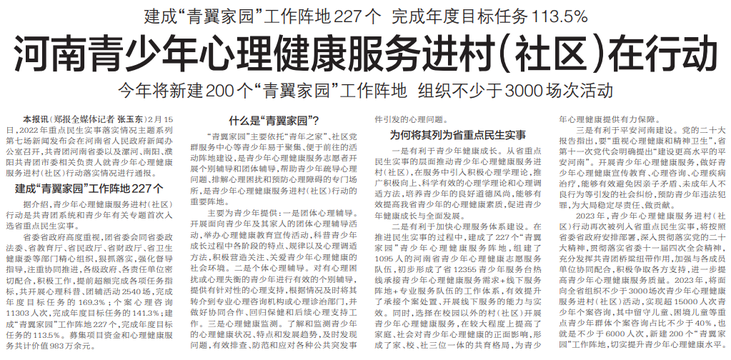 开展心理科普、团辅活动2540场,个案心理咨询11303人次,建成青翼家园工作阵地227个,分别完成年度目标任务的169.3%、141.3%、113.5%……2月15日,省政府新闻办召开河南省“实事惠民生 聚力谋出彩”系列第七场新闻发布会,介绍由团省委牵头实施的青少年心理健康服务进村(社区)行动落实情况并答记者问。(今日《河南日报》3版)